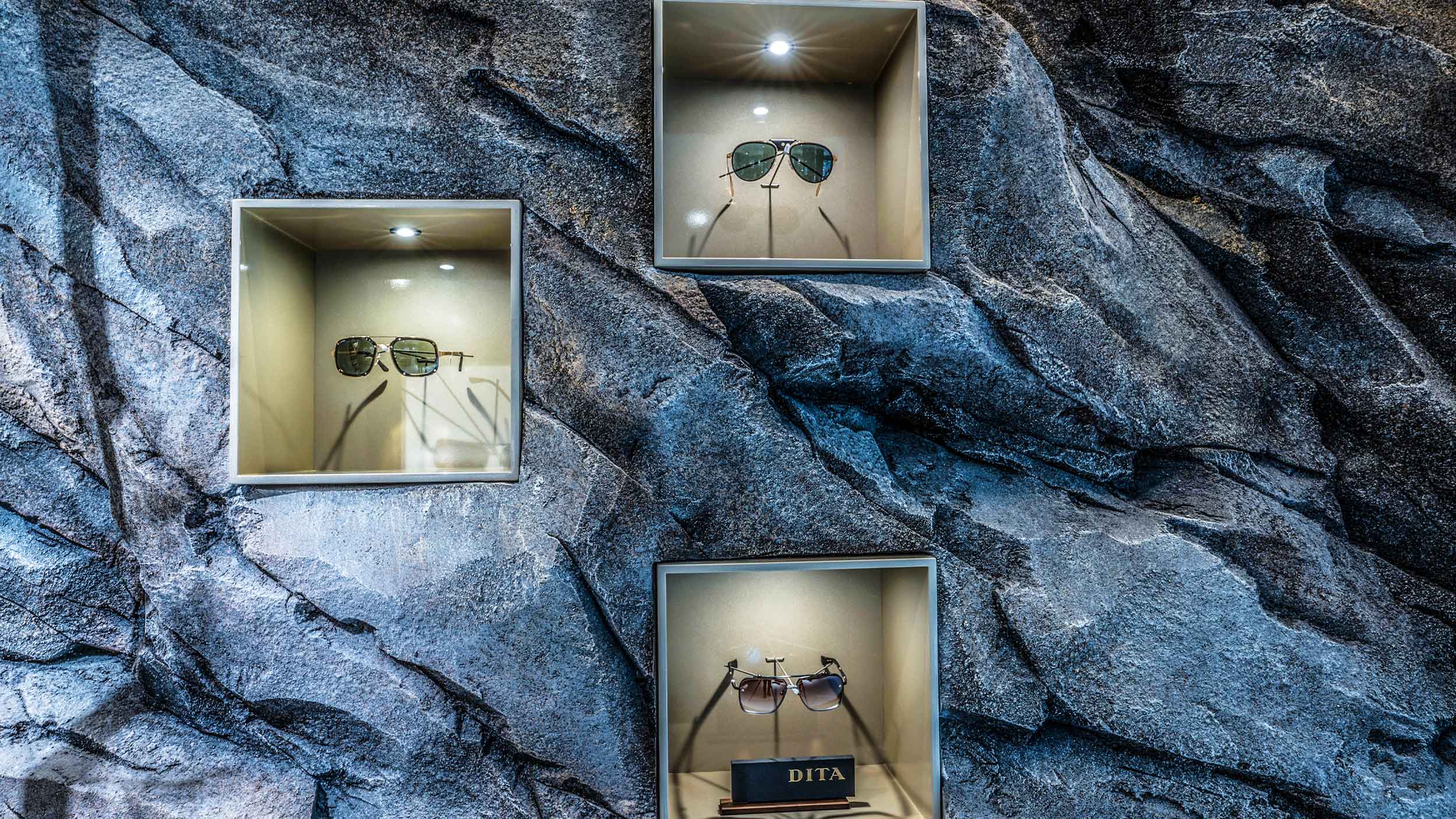 The interior designers aimed to give the space a hospitable character that was more reminiscent of a hotel lounge than a classic opticians' store. To this end, the client gave them a largely free hand. The new interior therefore surprises with an eclectic mix of styles and materials: bold, but at the same time warm and friendly. Old pink upholstered furniture and Prussian blue walls recall the colorfulness of Flemish painting. The columns in the center of the room, tiled with shiny gold tiles, add a contemporary accent. The absolute eye-catcher of the interior, however, is the right side wall, which has been deceptively designed as a raw rock made of concrete. In this charming environment, lighting has the important task not only of perfectly bringing out the qualities of materials and surfaces, but also of structuring the space and directing the eye.